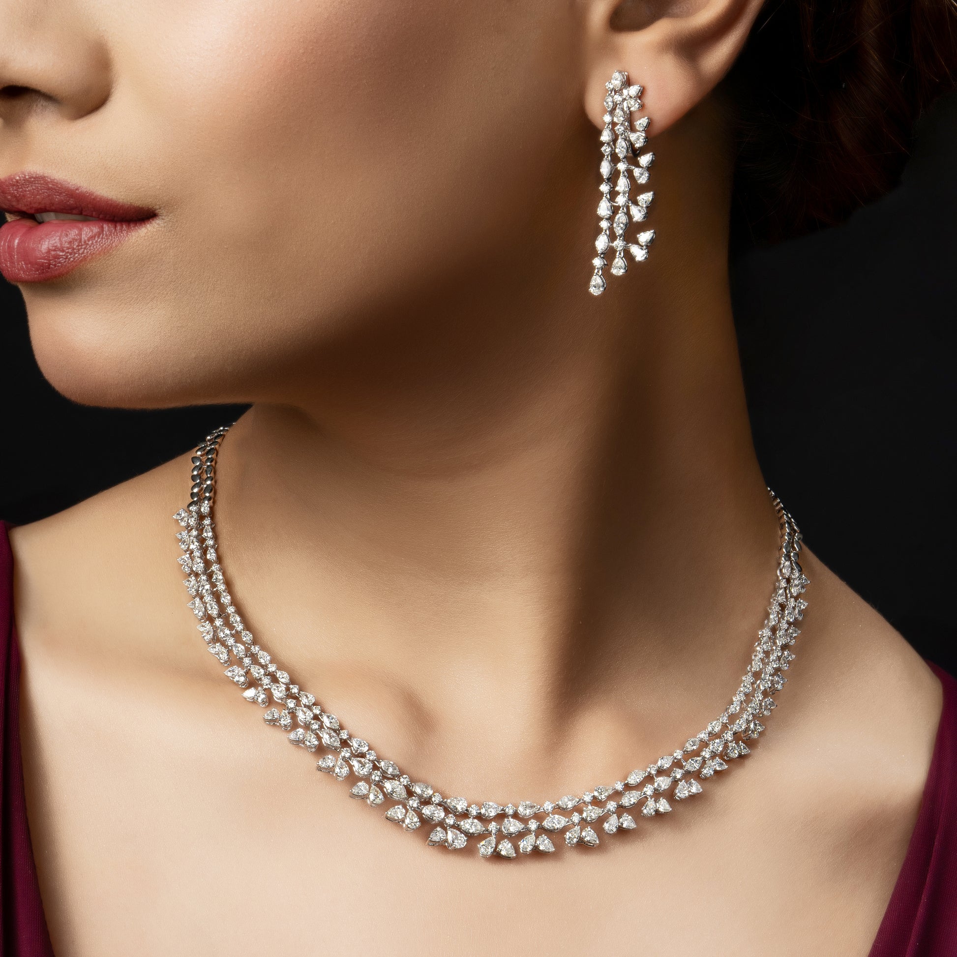 A graceful duet of triple-layered diamond strands and fluid drop earrings, capturing the elegance of diamonds in motion.